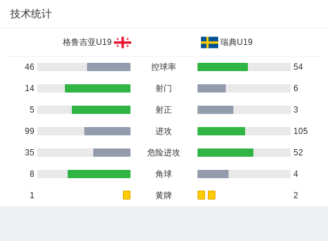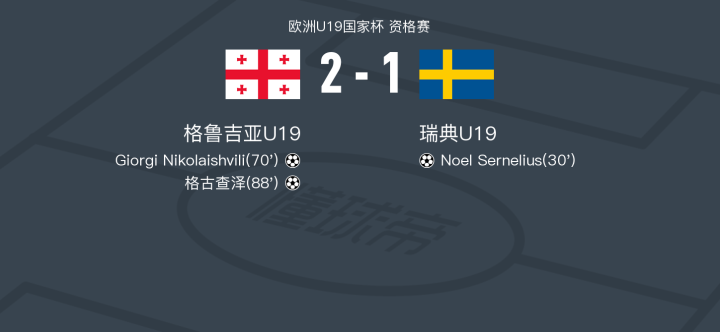 在欧洲U19国家杯资格赛中,格鲁吉亚U19迎战瑞典U19。比赛中,瑞典U19的Noel Sernelius在队友viggo jeppsson的助攻下率先破门,为球队取得领先。随后,格鲁吉亚U19的Giorgi Nikolaishvili扳平比分,展现了球队的顽强斗志。比赛接近尾声时,格鲁吉亚U19的格古查泽在萨穆希亚的助攻下打入制胜一球。最终,格鲁吉亚U19以2-1战胜瑞典U19,取得了比赛的胜利。