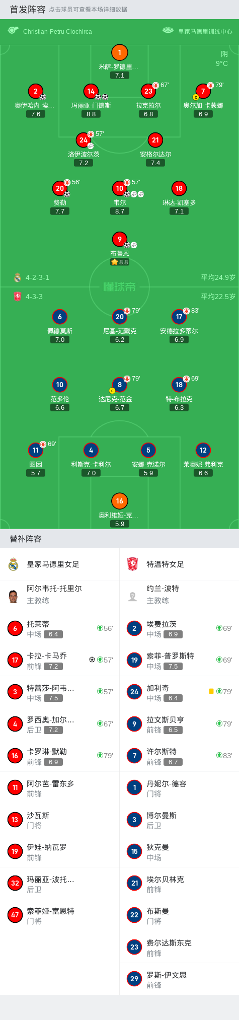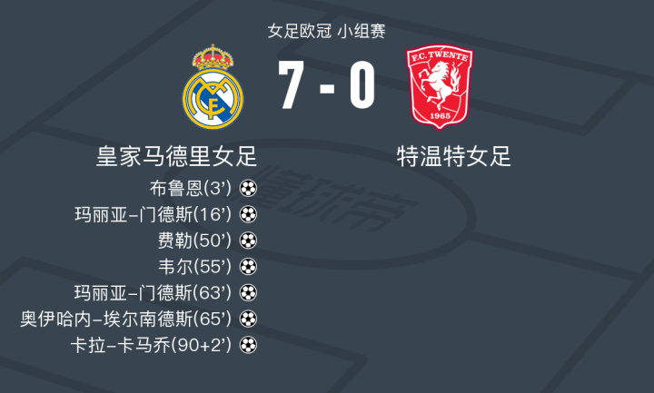 皇家马德里女足7-0狂胜特温特女足,玛丽亚-门德斯两球,卡拉-卡马乔破门