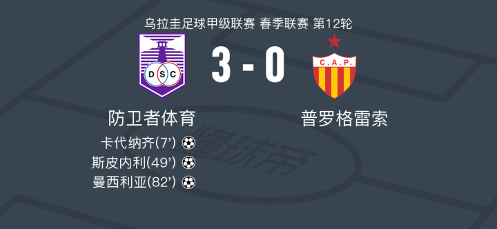 在乌拉圭足球甲级联赛春季联赛第12轮的比赛中,防卫者体育坐镇主场迎战普罗格雷索。比赛中,防卫者体育的卡代纳齐率先为球队打开局面,随后斯皮内利再下一城,曼西利亚则锦上添花,帮助球队锁定胜局。最终,防卫者体育以3-0的比分完胜普罗格雷索。