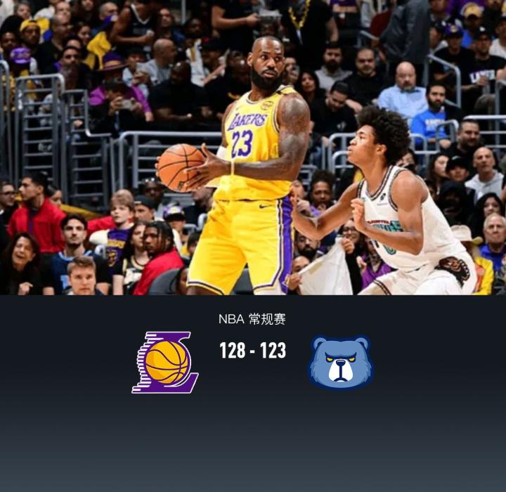 第四节,开节詹姆斯领衔替补阵容迅速反超比分,灰熊依旧是依靠内线优势得分止血,随后双方紧咬比分拉锯,比赛收官段湖人浓眉连中三分詹姆斯连续暴扣将分差拉开至8分,灰熊极为顽强追至4分维持悬念,湖人里夫斯三分领先至7分,随后灰熊肯纳德三分、阿尔达马补篮续命追至3分,好在湖人浓眉罚球全中彻底收下比赛,全场结束,湖人128-123战胜灰熊。