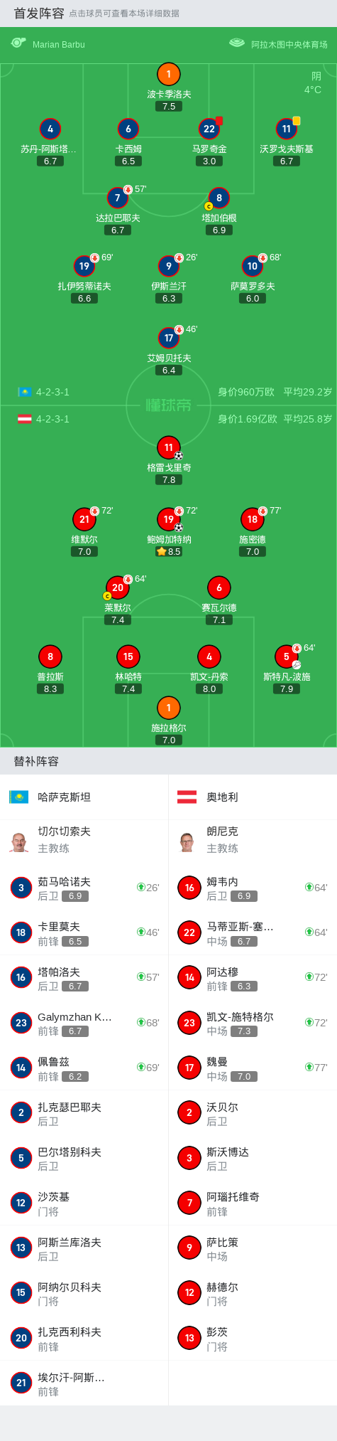奥地利2-0哈萨克斯坦,鲍姆加特纳、格雷戈里奇破门