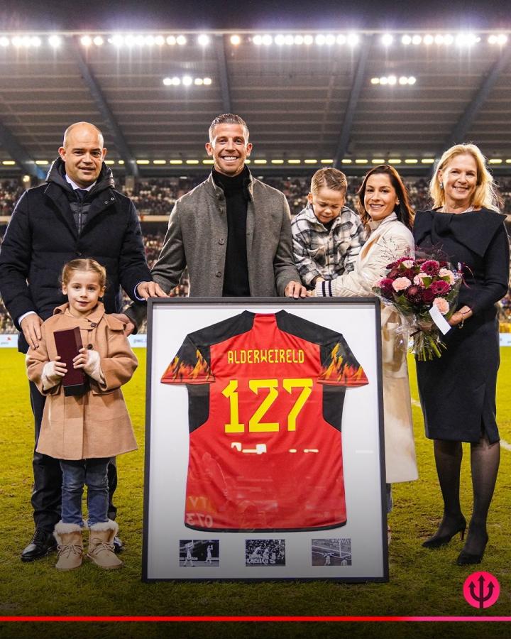 曾为比利时队出场127次,托比接受致敬并获赠纪念球衣