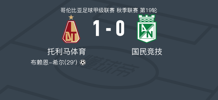 托利马体育1-0国民竞技,布赖恩-希尔制胜球