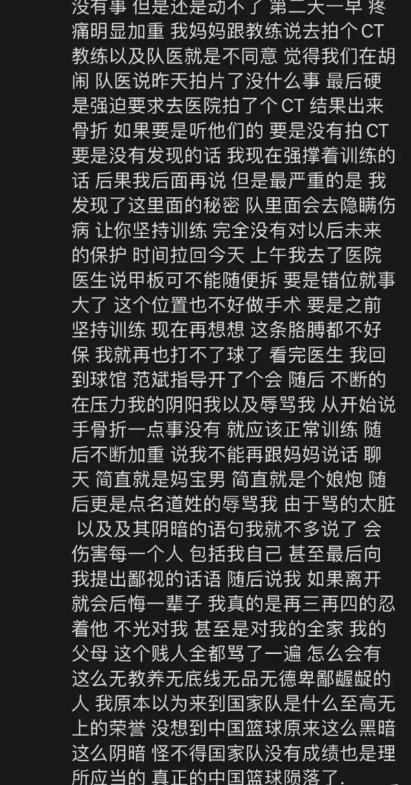 最近,范斌又被曝出对小球员很不好,甚至在小球员受伤了之后用错误的方式治疗,还不让小球员跟家长说。据报道,这个小球员叫姚清源,只有14岁,潜力满满,是前CBA球员姚锴夫的儿子。