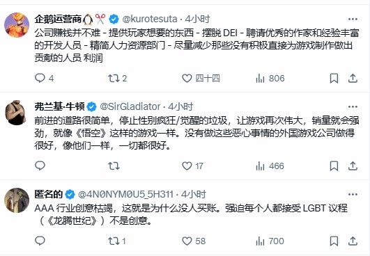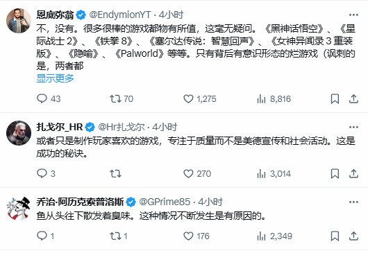 更有玩家表示,近些年发售的《黑神话》《星际战士2》《塞尔达智慧的再现》《暗喻幻想》《幻兽帕鲁》《博德之门3》等都没有那些离谱的DEI内容灌输,且都取得了瞩目的数据和成就,IGN所举得两个例子恰巧说明了——只要你不在游戏中掺杂那些弱智观念,就会做的很好。