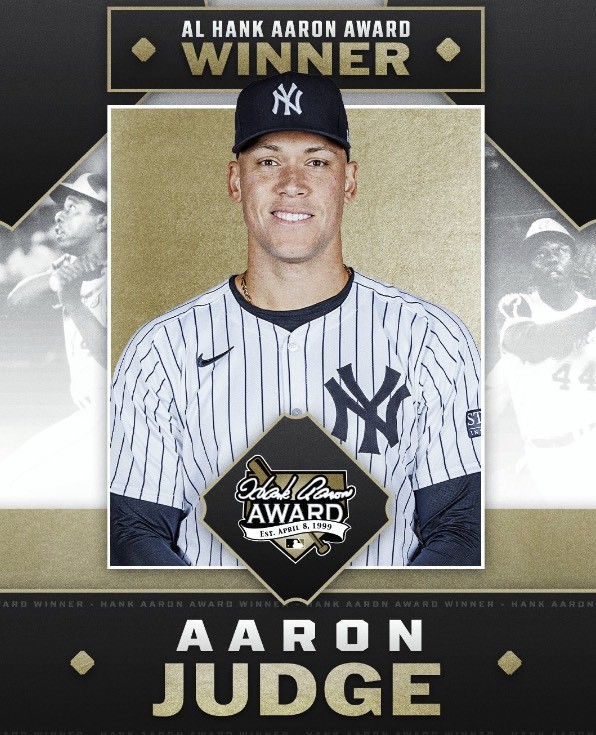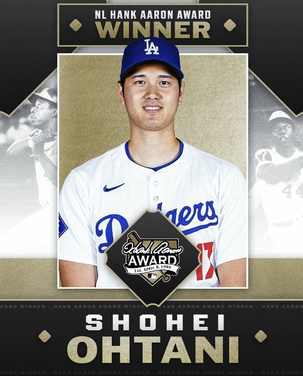 汉克-阿伦奖是美职大联盟颁给各联盟当年度最佳打者的奖项。今年大谷翔平打了159场比赛,缔造了史无前例的“50轰+50盗”纪录,打出54全垒打、59盗垒、130分打点的打击成绩,是国联全垒打、打点双冠王。