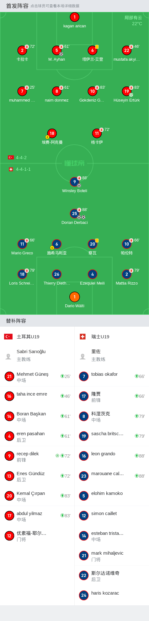 北京时间11月15日国家队友谊赛,土耳其U19对阵瑞士U19。土耳其U19Hüseyin Ertürk破门,recep dilek破门,M. Ayhan破门。瑞士U19Dorian Derbaci梅开二度,Winsley Boteli破门。最终比分土耳其U19 3-3 瑞士U19。
