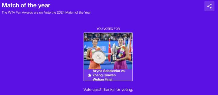 WTA年度最佳评选活动新增了最佳比赛的候选,郑钦文与萨巴伦卡的武网决赛入选。投票链接>>