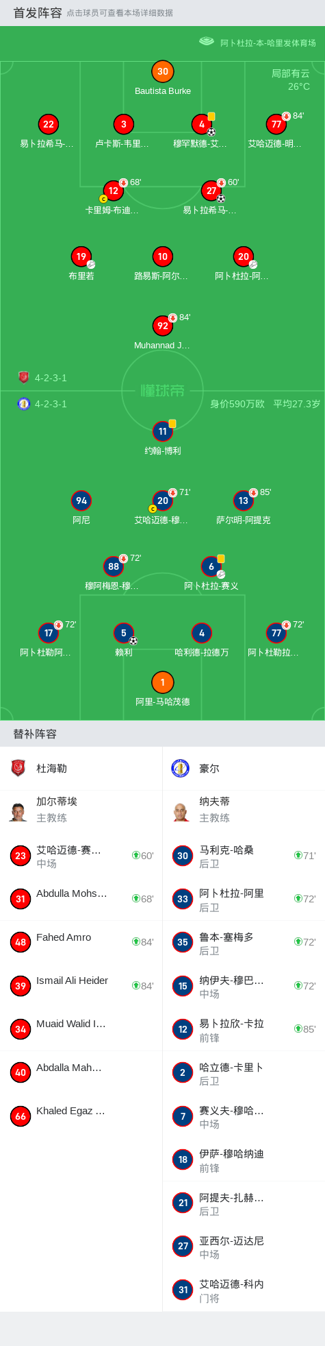 第18分钟,杜海勒球员阿卜杜拉-阿卜杜勒萨拉姆助攻易卜拉希马-迪亚洛打入一球。