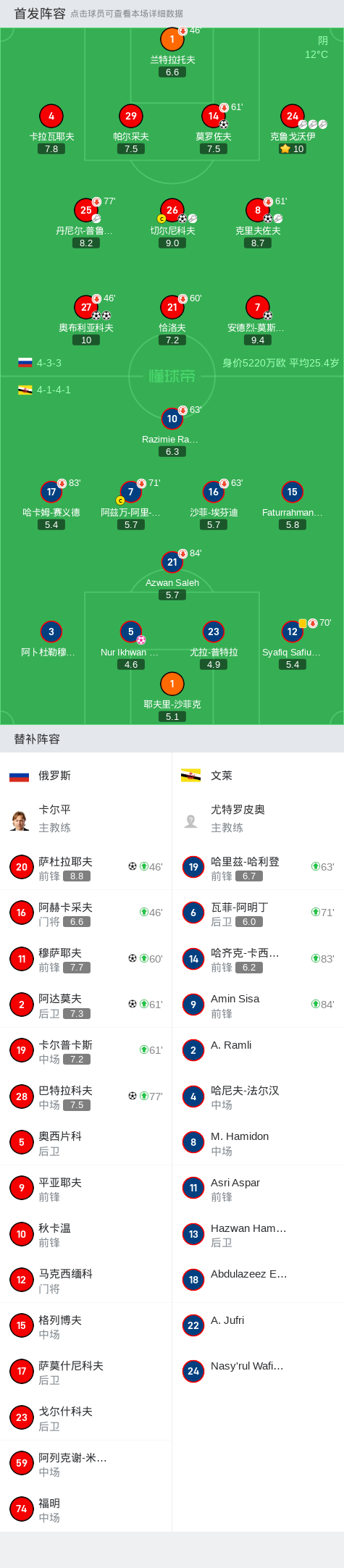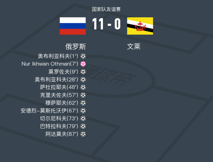 北京时间11月16日国家队友谊赛,俄罗斯对阵文莱。俄罗斯奥布利亚科夫梅开二度,莫罗佐夫破门,萨杜拉耶夫破门,克里夫佐夫破门,穆萨耶夫破门,安德烈-莫斯托沃伊破门,切尔尼科夫破门,巴特拉科夫破门,阿达莫夫破门。文莱Nur Ikhwan Othman自摆乌龙。最终比分俄罗斯 11-0 文莱。