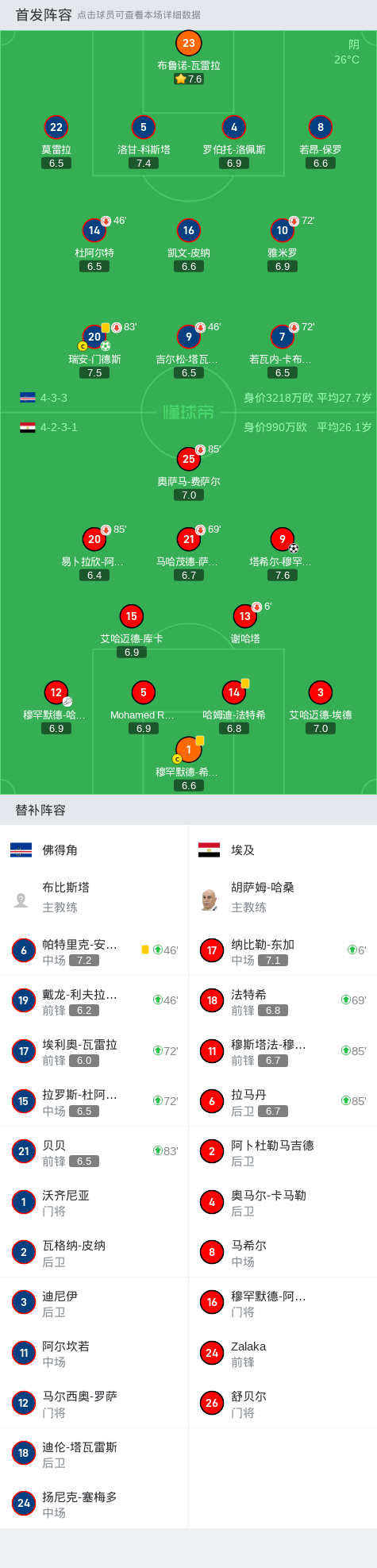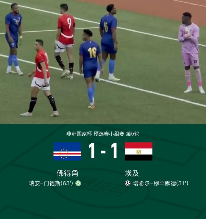 佛得角1-1埃及,塔希尔-穆罕默德先拔头筹,瑞安-门德斯点射扳平
