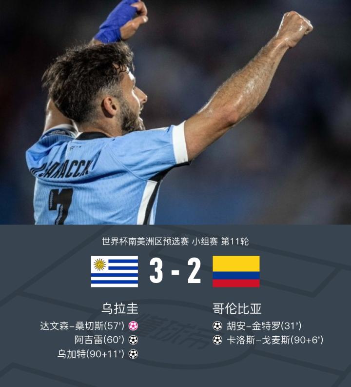 第90+10分钟,乌加特补射绝杀,乌拉圭3-2哥伦比亚