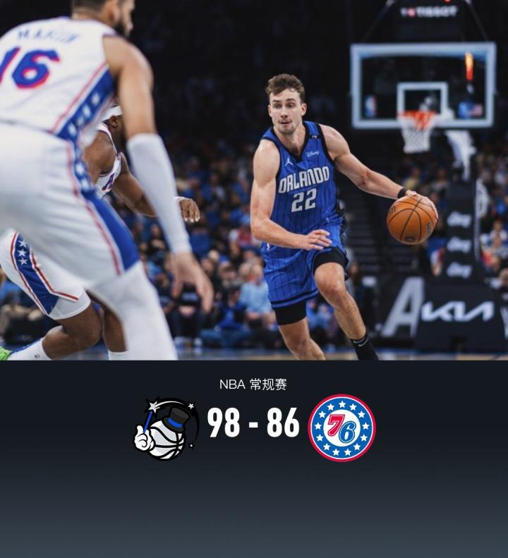 第四节魔术萨格斯拿下11分,76人贾里德-麦凯恩拿下5分,最终魔术98-86战胜76人