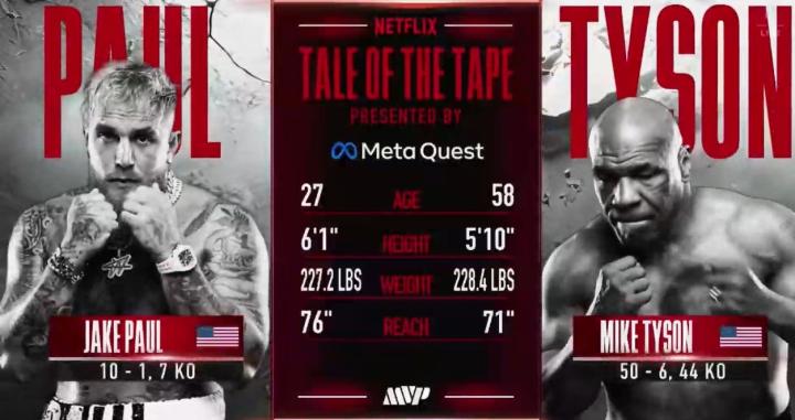 北京时间11月16日,现年58岁的拳王泰森再次站上职业赛场对阵网红拳手杰克-保罗。这场比赛被认定是一次正式的职业拳击比赛,计入职业生涯战绩。全场比赛共8个回合,每个回合时长2分钟,比赛在美国德克萨斯州AT&T体育馆举行。最终,双方打满回合,杰克-保罗凭借点数优势获胜