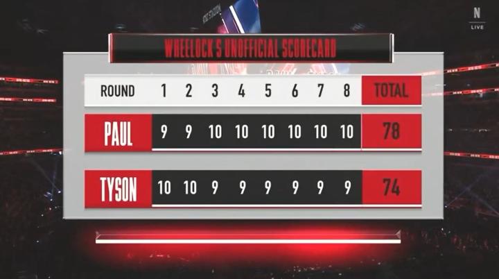 前4个回合,杰克-保罗牢牢占据优势,利用全场移动消耗泰森体力,随后被泰森打平。截至第7回合,泰森共出手87拳,中16;杰克-保罗出手200拳,中59。最终,泰森全场点数落后,杰克-保罗获胜。