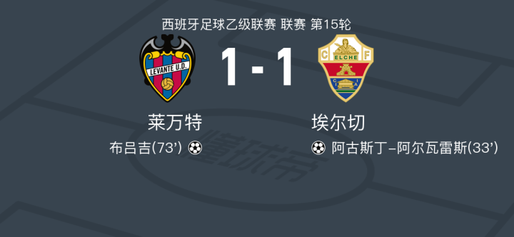 莱万特1-1埃尔切,阿古斯丁-阿尔瓦雷斯先拔头筹,布吕吉救主