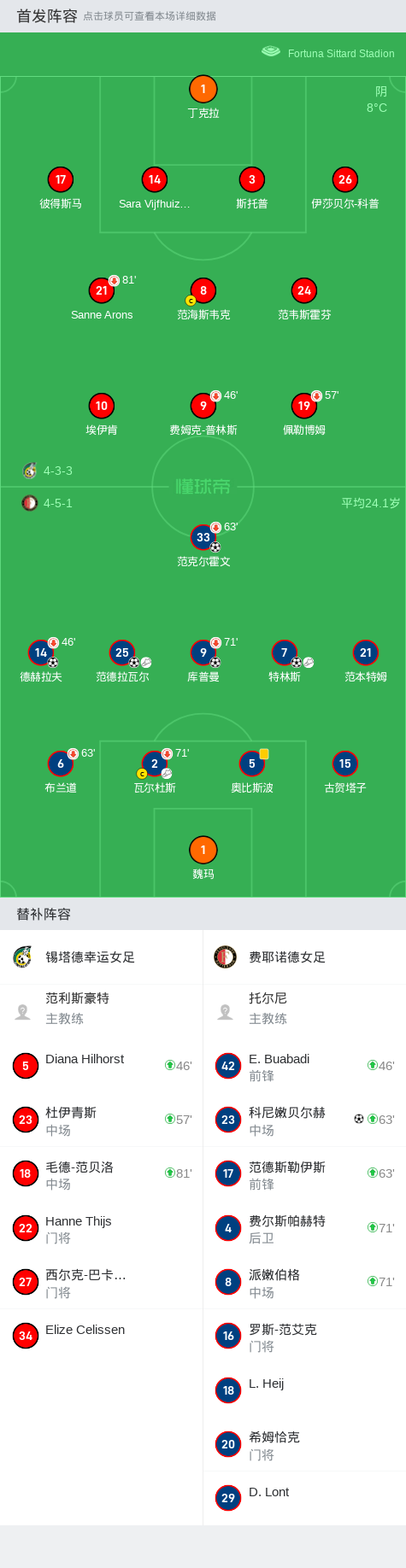 第76分钟,费耶诺德女足球员E. Buabadi助攻范德拉瓦尔打入一球。