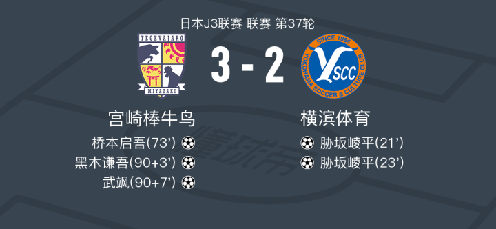 宫崎棒牛鸟3-2逆转横滨体育,武飒破门,黑木谦吾建功