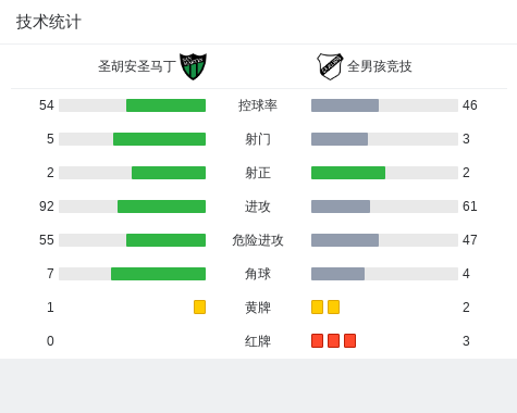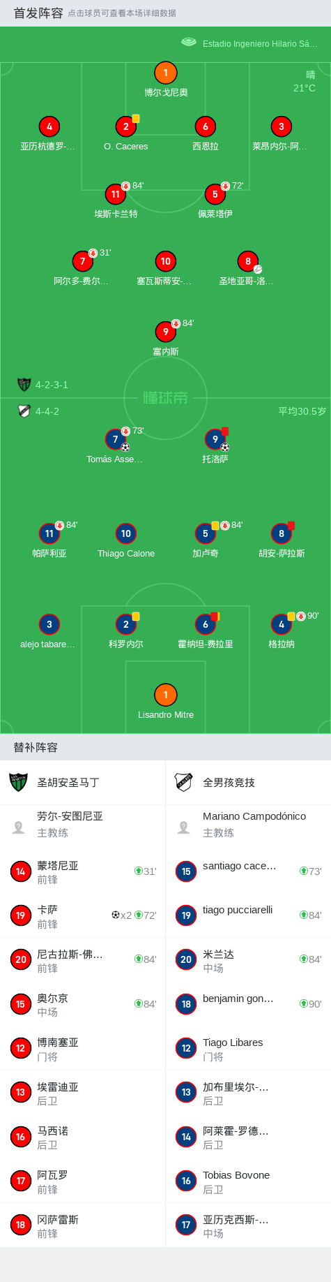 在阿根廷足球乙级联赛升级附加赛1/4决赛次回合的较量中,圣胡安圣马丁坐镇主场迎战全男孩竞技。比赛中,全男孩竞技的托洛萨率先为球队取得领先,随后Tomás Assennato再下一城,扩大了领先优势。然而,圣胡安圣马丁的卡萨表现出色,凭借个人能力打入两球,帮助球队扳平比分。 比赛中,全男孩竞技遭遇多次判罚,托洛萨和胡安-萨拉斯分别被罚下,霍纳坦-费拉里也因累计黄牌被罚出场。最终,圣胡安圣马丁凭借卡萨的梅开二度,以2-2战平全男孩竞技。两回合总比分圣胡安圣马丁以3-2的优势晋级。