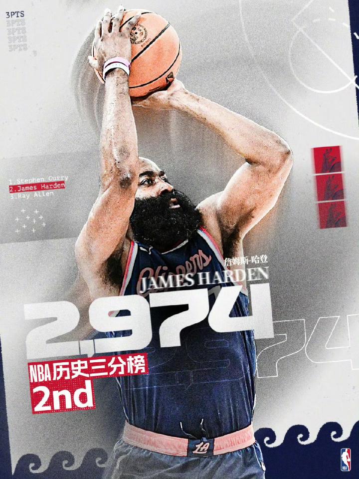 第一节,哈登飚中本场首记三分,生涯三分命中数来到2974记(最新为2975记),超越雷-阿伦独享NBA历史三分榜第二。目前排名历史第一的是库里的3782记三分。