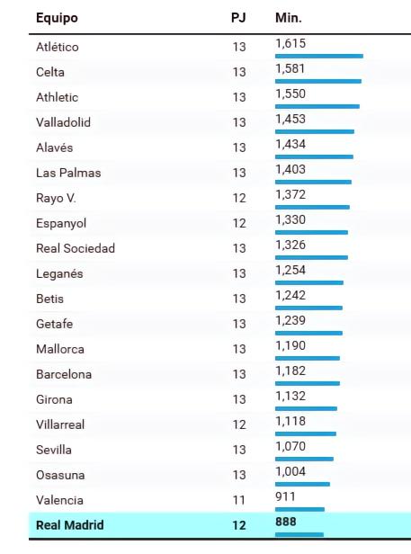 而在对阵奥萨苏纳的比赛中,由于上半场的伤病情况,替补数据有所上升——卜拉欣-迪亚斯(出场70分钟)、劳尔-阿森西奥(出场60分钟)、莫德里奇(出场45分钟)、居莱尔(出场15分钟)和恩德里克(出场15分钟),替补球员的出场时间增加了205分钟。