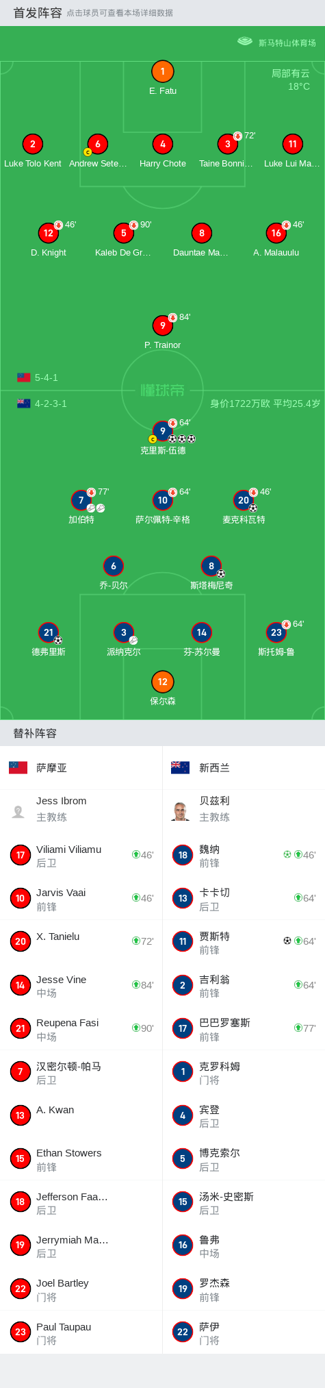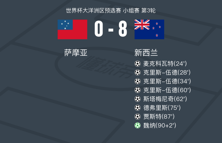 新西兰8-0狂胜萨摩亚,克里斯-伍德帽子戏法,魏纳替补1射1传