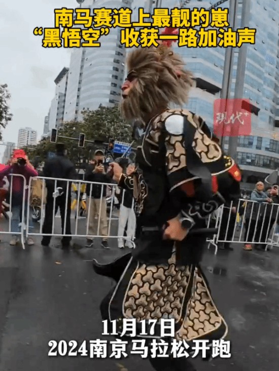 11月17日,2024南京马拉松开跑,3万跑友齐聚南京。“黑悟空”造型装扮的吴萌泽让人印象深刻,收获无数加油声。