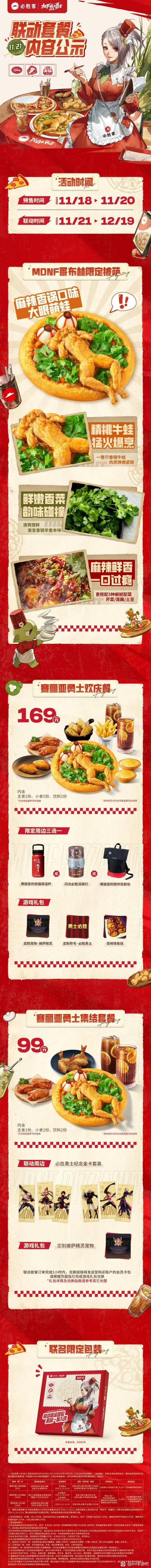 必胜客官方宣布将于 11月21日—12月19日 推出与 《地下城与勇士》(DNF) 的联动餐品。此次联动不仅包括 MDNF哥布林限定麻辣香锅牛蛙披萨(售价69元)和 赛丽亚勇士欢庆餐(售价169元),还推出了保温杯、双肩包等联名周边,以及DNF游戏礼包,吸引了不少玩家关注。