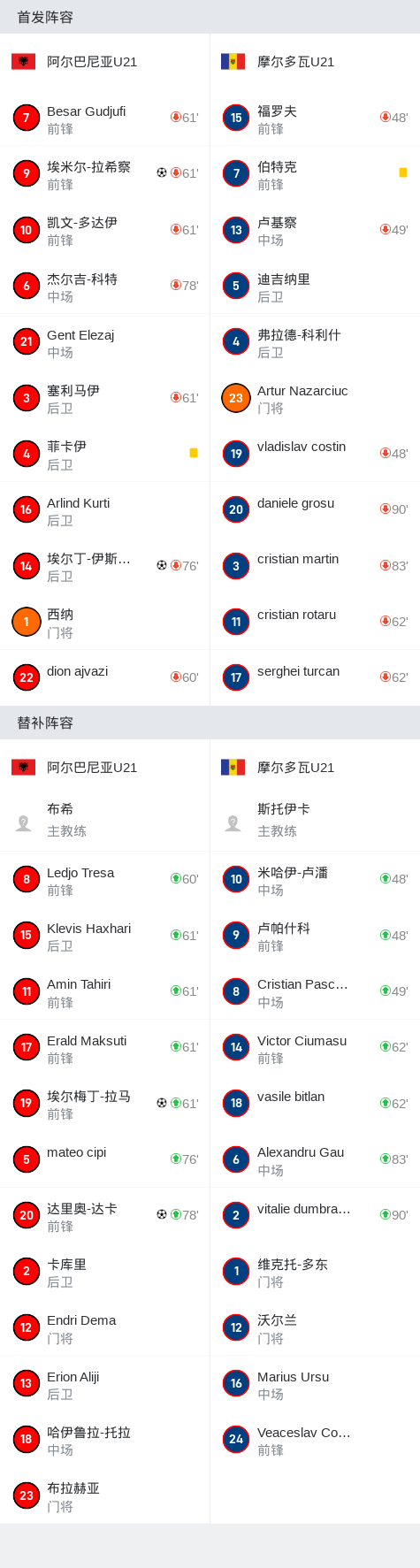 第17分钟,阿尔巴尼亚U21球员埃米尔-拉希察打入一球。