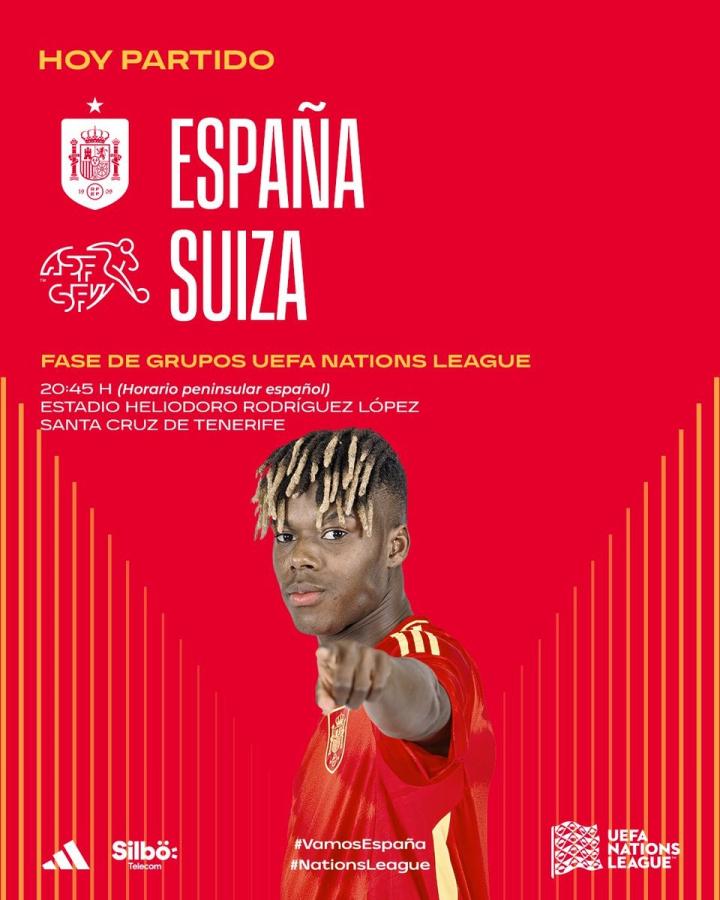 欧国联A级联赛第6轮,西班牙队将主场对阵瑞士队,赛前,西班牙队官方发布比赛海报。