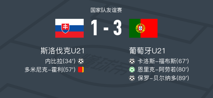 北京时间11月19日国家队友谊赛,斯洛伐克U21对阵葡萄牙U21。斯洛伐克U21内比拉破门。葡萄牙U21卡洛斯-福布斯破门,保罗-贝尔纳多破门,恩里克-阿劳若破门。最终比分斯洛伐克U21 1-3 葡萄牙U21。