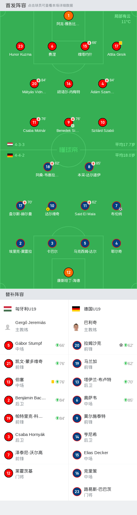 在欧洲U19国家杯资格赛中,匈牙利U19迎战德国U19。比赛中,匈牙利U19的Benedek Simon通过点球为球队取得领先。然而,德国U19展现了强大的反击能力,塔伊兰-布卢特助攻拉姆沙克扳平比分,随后布伦纳再下一城,帮助德国U19反超。最终,德国U19以2-1战胜匈牙利U19,取得了比赛的胜利。