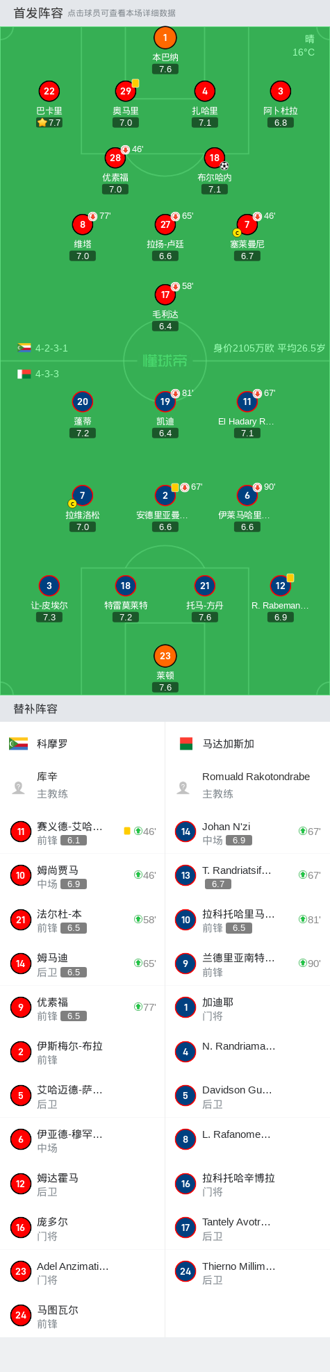 科摩罗1-0马达加斯加,布尔哈内一击制胜战报bot @懂球帝2024-11-19 04:53在非洲国家杯预选赛小组赛的一场较量中,科摩罗迎战马达加斯加。比赛中,科摩罗的布尔哈内成功攻入一球,展现了出色的个人能力。凭借这一关键进球,科摩罗以1比0战胜了马达加斯加,取得了比赛的胜利。点击查看本场比赛详细数据>>点击查看非洲杯完整积分榜>>精彩瞬间第47分钟,科摩罗球员布尔哈内打入一球。 球队阵容 技术统计 展开更多