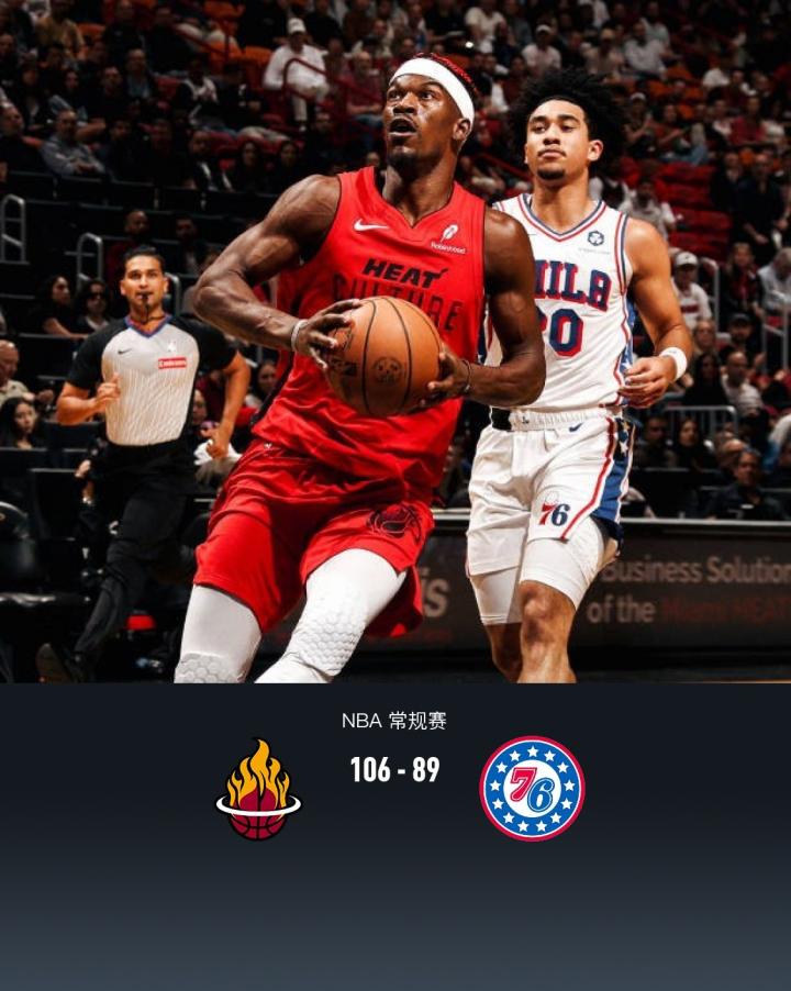 第四节热火吉米-巴特勒拿下6分,76人贾里德-麦凯恩拿下5分,最终热火106-89战胜76人