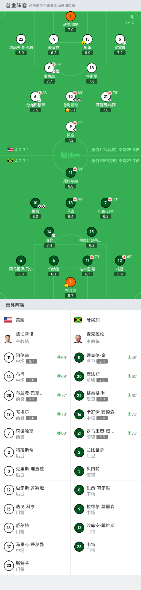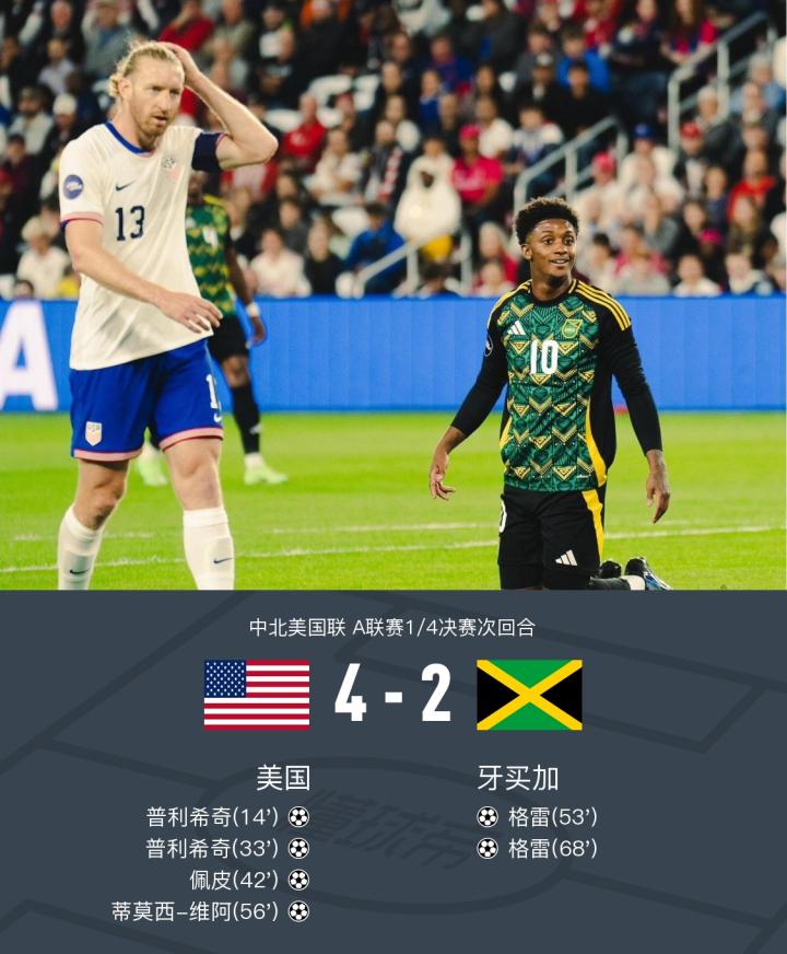 美国4-2牙买加成功晋级,普利希奇双响,佩皮、蒂莫西-维阿破门