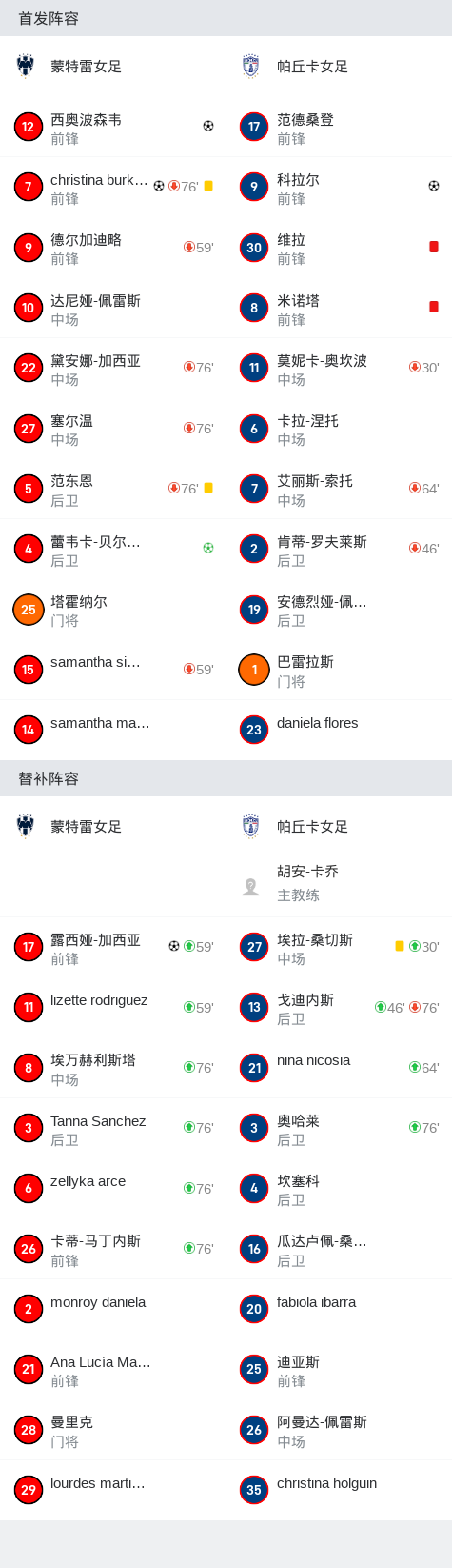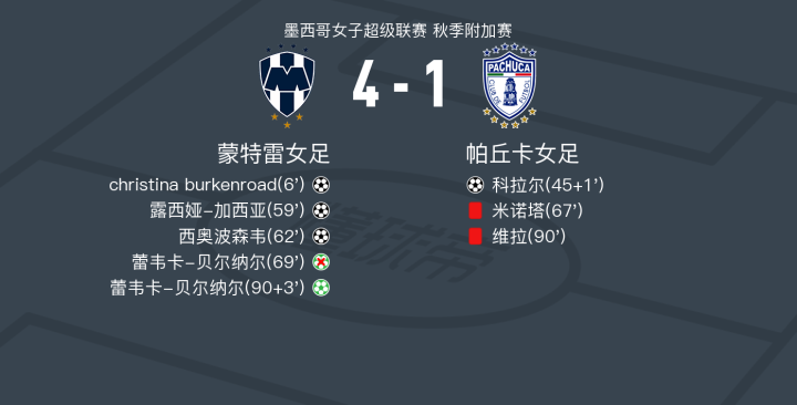 蒙特雷女足4-1大胜帕丘卡女足取墨女超3连胜,蕾韦卡-贝尔纳尔点射,西奥波森韦破门