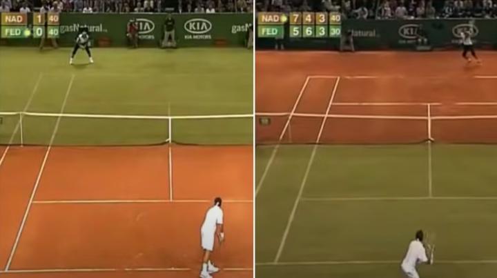 (注:2007年,费德勒和纳达尔在西班牙马略卡进行了一场表演赛,比赛场地一侧是草地,另一侧是红土)