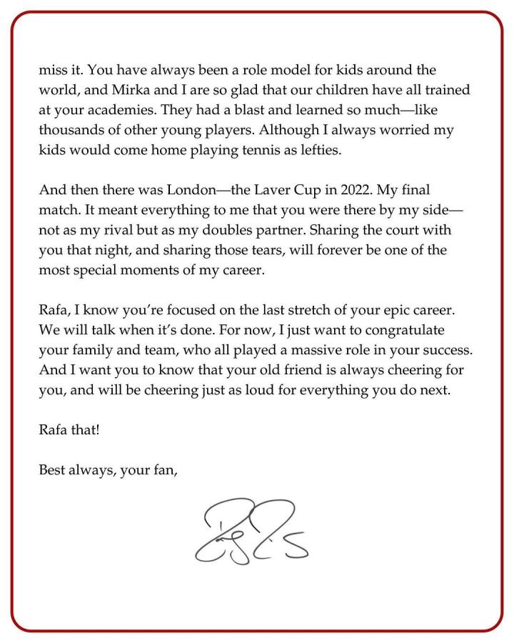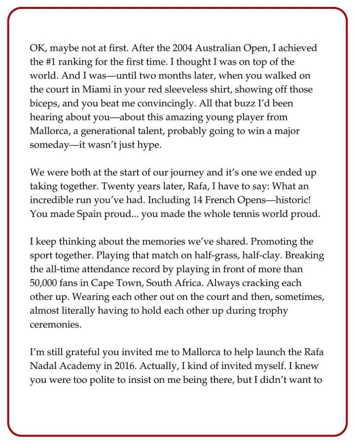 拉法,我知道你正专注于你史诗般的职业生涯的最后一段旅程,等你退役之后我们再细聊。现在,我只想祝贺你的家人和团队,他们都在你的成功中发挥了巨大作用。我想让你知道,你的老朋友一直在为你加油,也会为你接下来所做的一切大声欢呼。