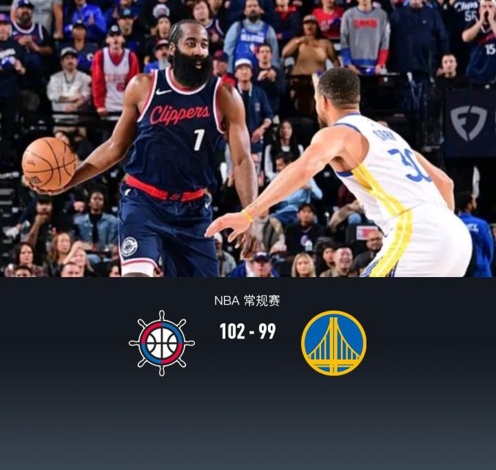 快船102-99险胜勇士!哈登12+6+16,库里26+7+6错失绝平三分