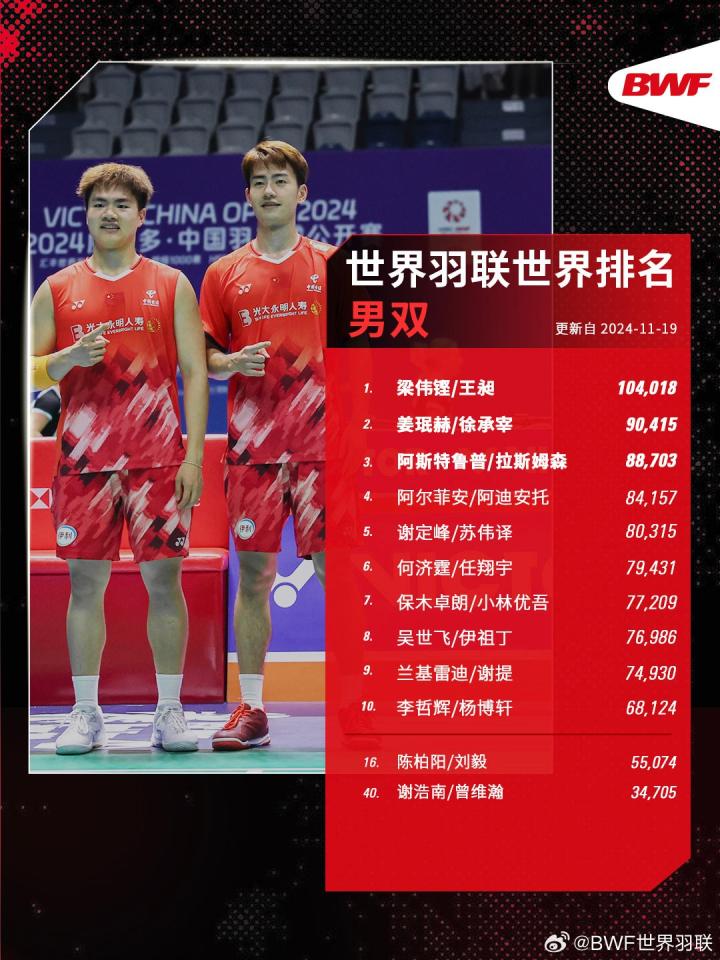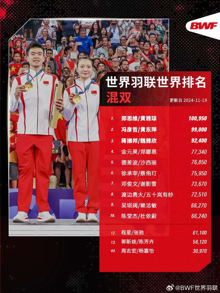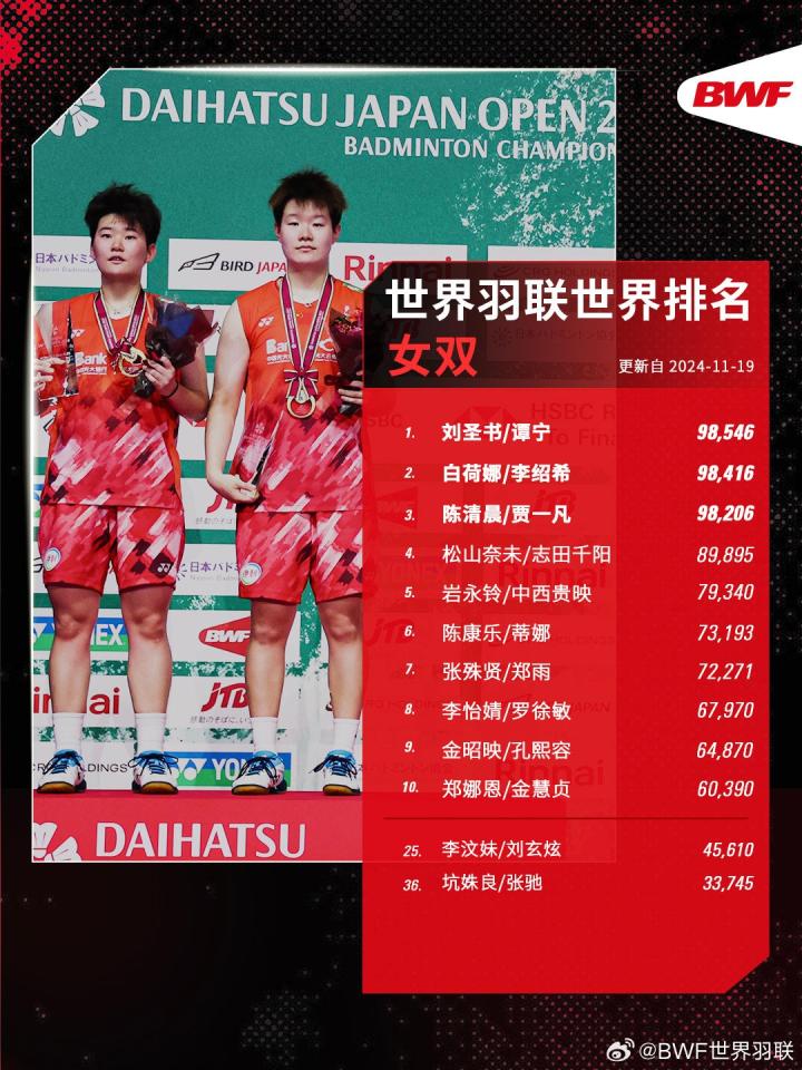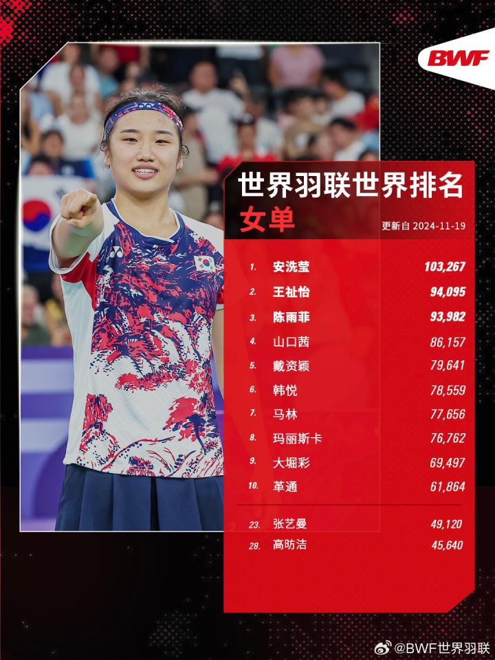 北京时间11月19日,BWF世界羽联公布2024年第47周世界排名。