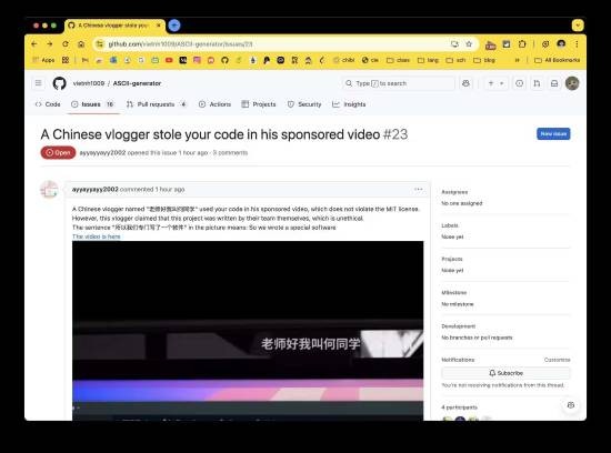 在介绍核心功能(字符画转制程序)时,何同学在视频中声称“我们专门写了一个软件”,引发了大量网友的质疑。因为这个软件是GitHub上颇受欢迎的开源项目 "ASCII generator",并且他还删除了原作者的信息。