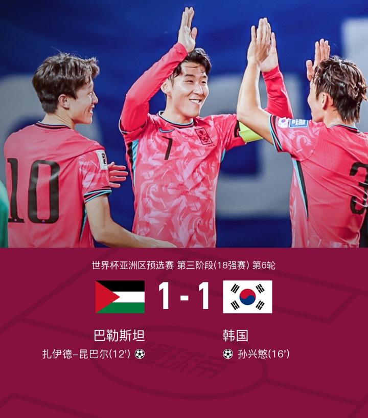 在世界杯亚洲区预选赛第三阶段的较量中,巴勒斯坦迎战韩国。上半场,扎伊德-昆巴尔率先为球队取得进球,随后李在城送出助攻,孙兴慜破门扳平比分。下半场,孙兴慜内切射门造险后进球被吹越位。最终韩国队客场1-1战平巴勒斯坦,世预赛两回合对阵均收获平局。