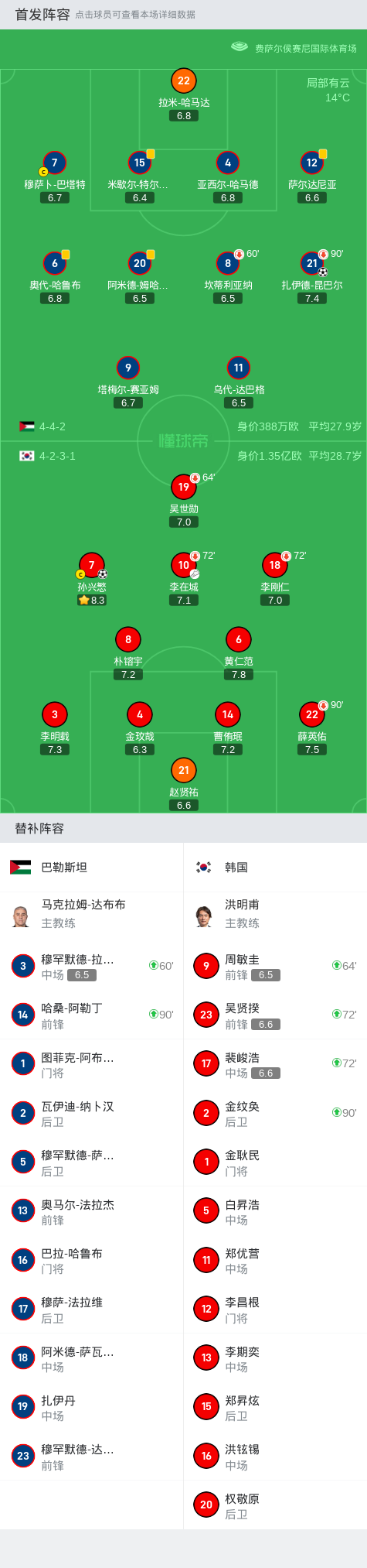 韩国1-1客平巴勒斯坦,孙兴慜破门+进球被吹