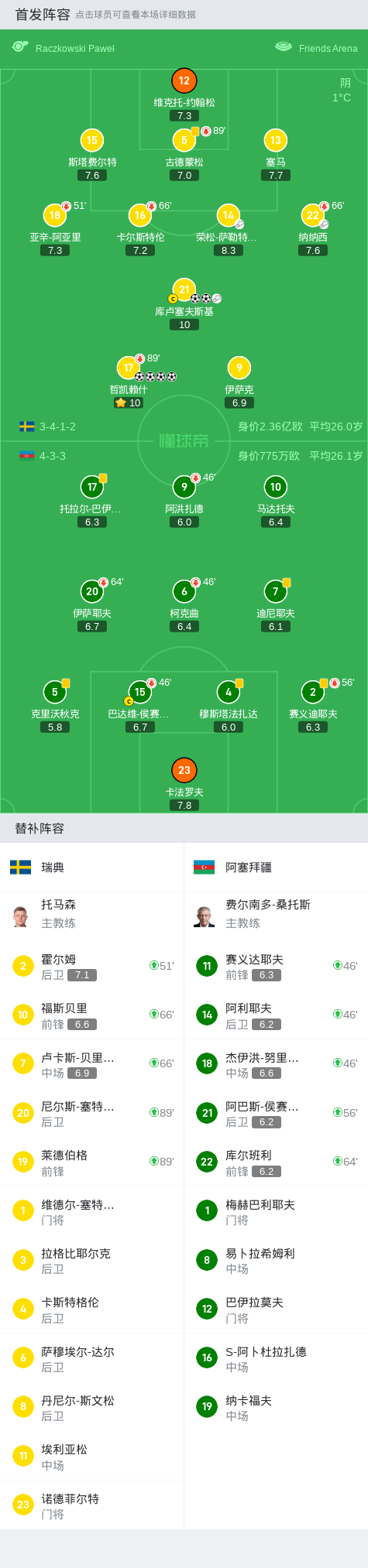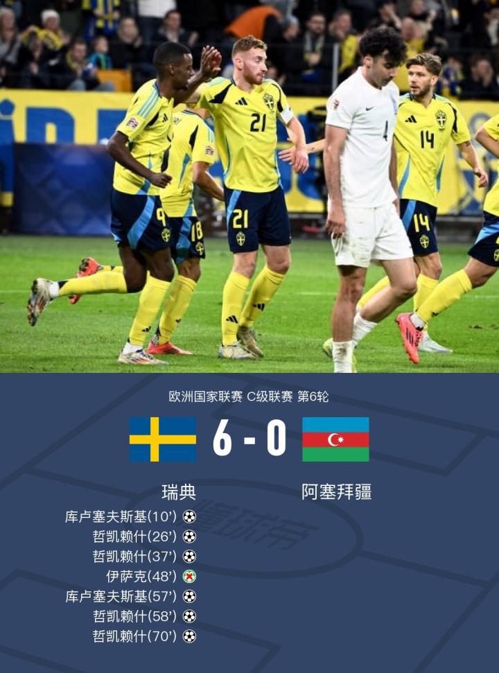 瑞典6-0狂扫阿塞拜疆,哲凯赖什大四喜,库卢塞夫斯基双响,伊萨克失点