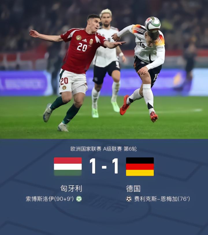 在欧洲国家联赛A级联赛的一场较量中,匈牙利与德国展开对决。上半场亨里希斯任意球造险,努贝尔多次扑救,下半场布兰特进球被吹,哈弗茨中柱,恩梅加补射破门,索博斯洛伊点球绝平。最终,双方以1-1握手言和。