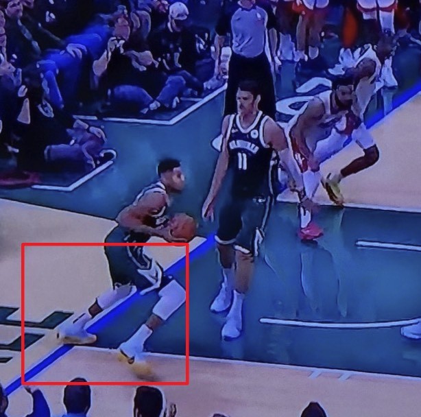 字母哥拿到球后,在传给利拉德让后者命中关键上篮前,字母哥的左脚就已经踩线了,但是现场的裁判没有发现。