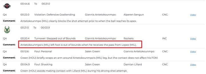 北京时间11月20日,NBA官方发布昨日雄鹿vs火箭比赛的裁判报告,确定字母哥在传给利拉德命中关键上篮前,左脚已经出界。