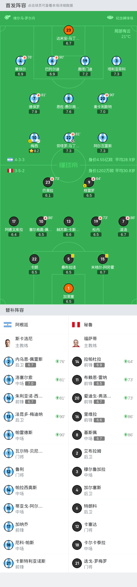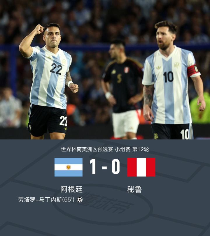 在世界杯南美洲区预选赛的小组赛中,阿根廷迎战秘鲁。比赛中,阿尔瓦雷斯中柱,梅西送出精妙助攻,劳塔罗凌空侧钩一击制胜。最终,阿根廷以1比0战胜秘鲁。