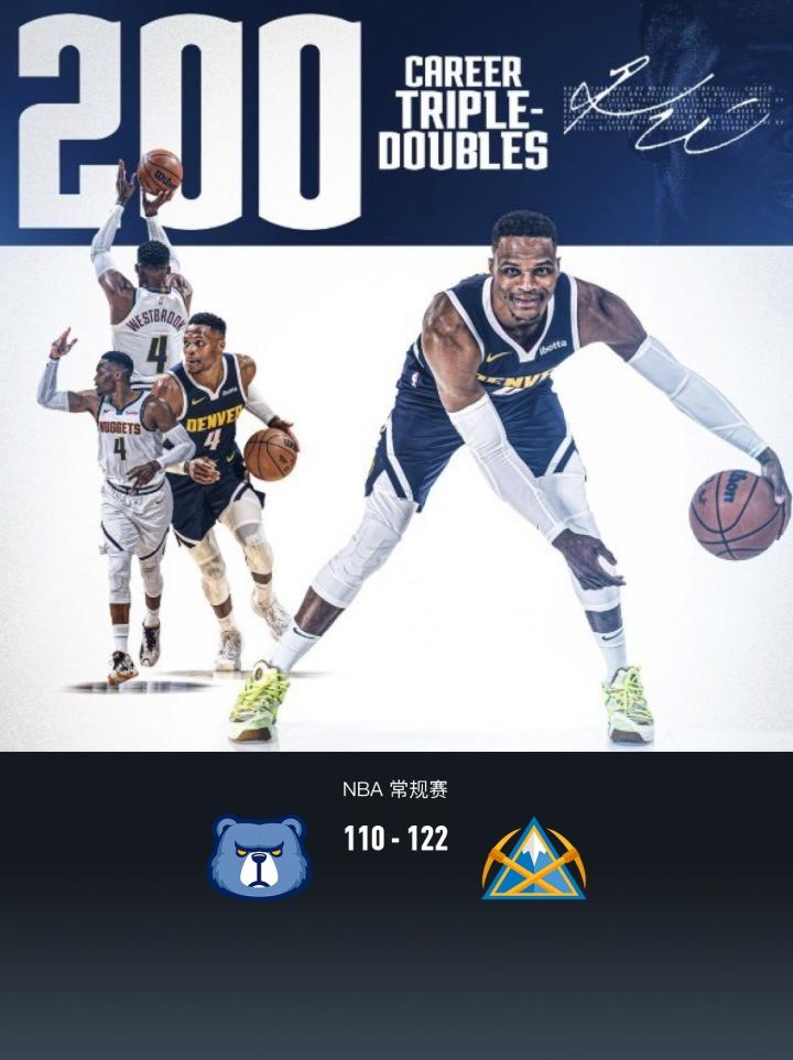 北京时间11月20日,NBA杯小组赛,掘金122-110轻取灰熊。本场比赛,威少砍下12分10板14助,取得生涯第200次三双,为历史首人。