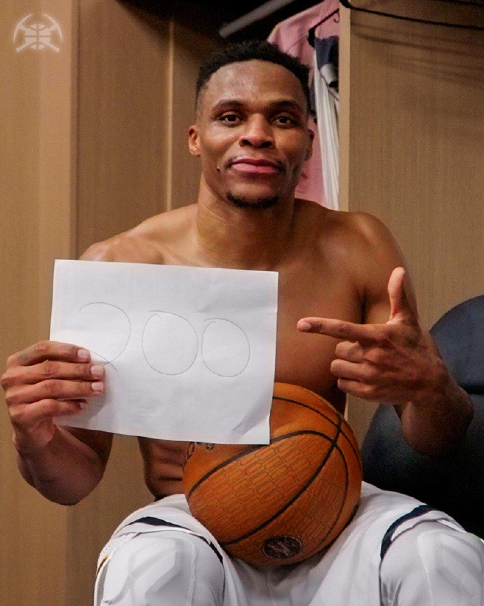 回到更衣室,威少也效仿张伯伦纪念单场100分的经典照片,手拿写着“200”的纸拍照留念。